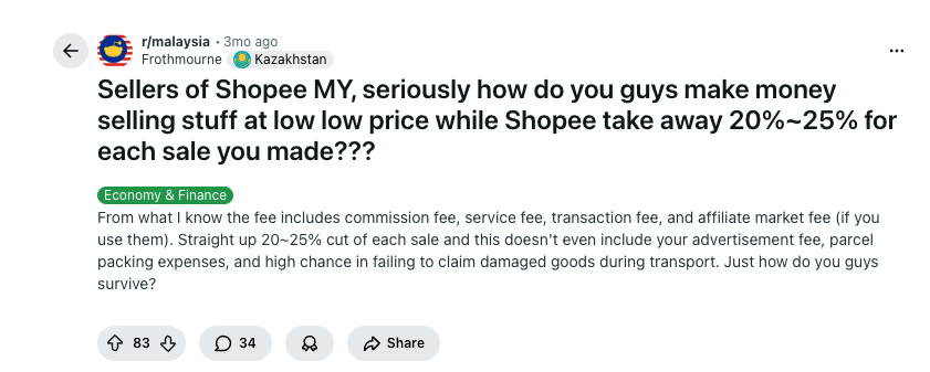 “Sellers of Shopee MY, seriously how do you make money selling stuff at low prices while Shopee takes away 20%~25% for each sale you made??? Just how do you survive?”